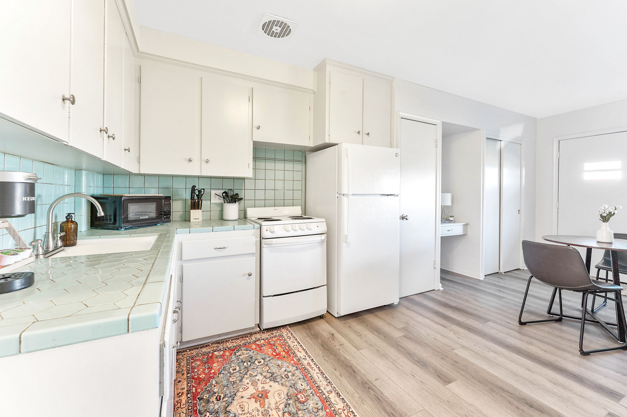 Kitchen, Cooking basics, Dishes and silverware, Microwave, Oven, Refrigerator, Stove, Toaster, Wine glasses